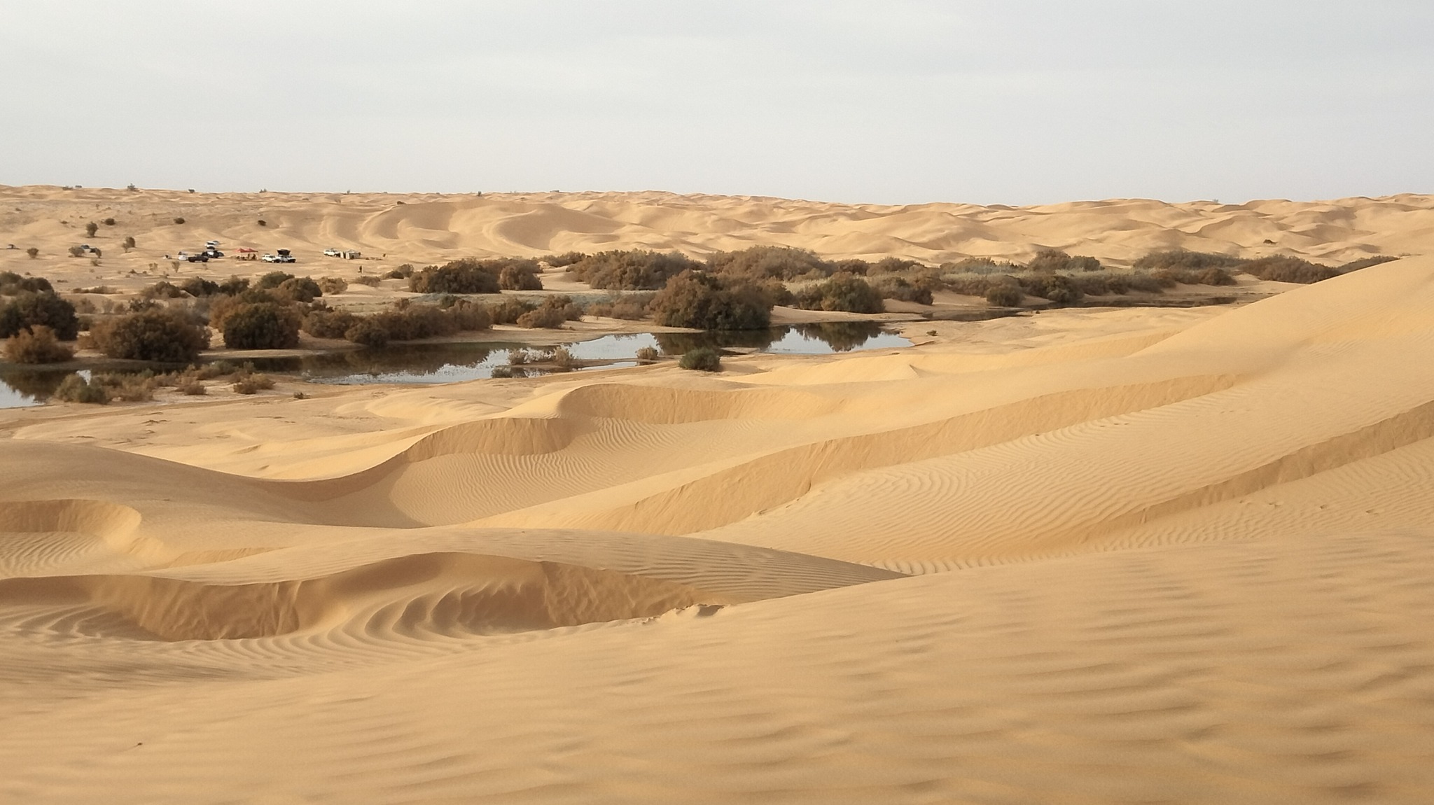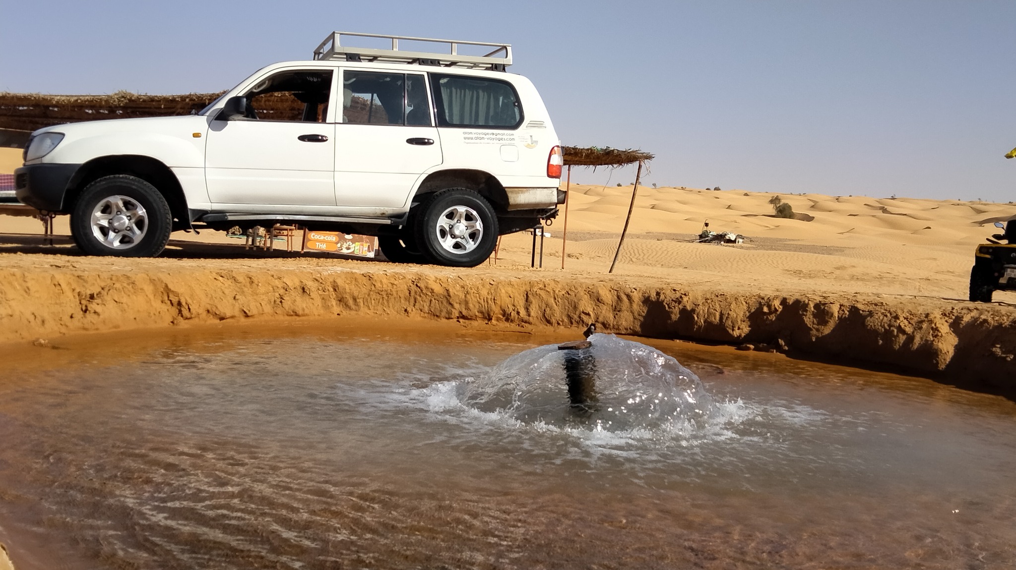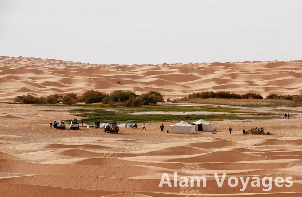 Petit déjeuner et continuation vers les Dunes de Dykanis puis lac Houidhat Ereched , arrivée et installation des tentes à coté de la source d’eau chaude et déjeuner.