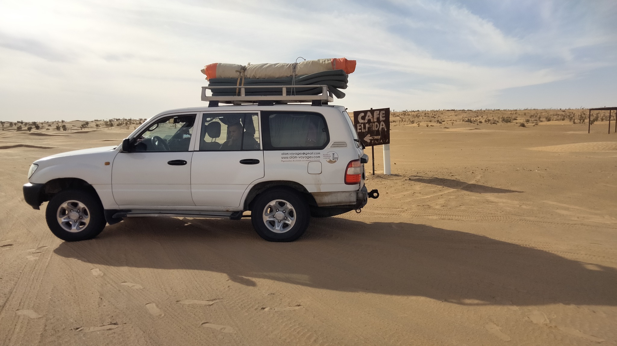 Arrivée et rencontre avec le reste notre équipe (chauffeur et cuisinier en voiture pickup chargée des matelas, couverture, nourriture et eau…) pour commencer le raid en 4x4 dans le désert Tunisien et traversée des dunes de direction El Mida