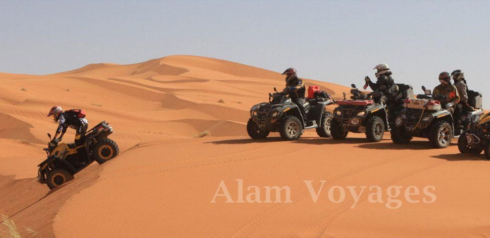 Pour les fans du quad et les amoureux de l'adrénaline... voici le circuit qu'il vous faut... Une randonnée de quelques jours en plein désert pour traverser les dunes de sable à perte de vue...l'Erg comme le Reg ... Un mix de découverte, de paysages et d'aventure rien que pour vous... Entre bonnes mains accompagné d'un guide agréé par l'office de tourisme et d'un guide de quad qui connaît le désert comme le fond de sa poche! Le permis n'est pas obligatoire, mais des connaissances de base pour maîtriser un quad est nécessaire.
