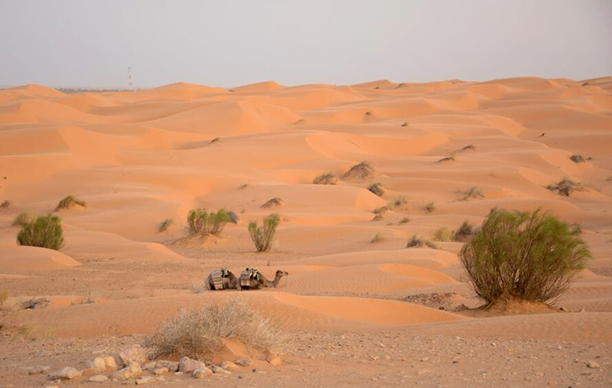 Petit déjeuner saharien et départ de notre caravane constituée d’un cuisinier d’un guide/chamelier et de ses dromadaires.