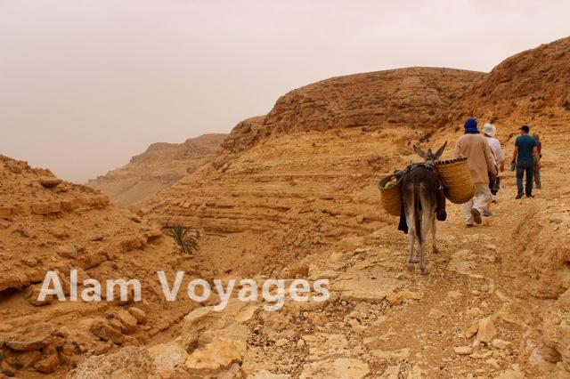 Le matin, départ avec notre guide et sa mule pour Toujane où l’on arrive après environ 5h de marche sur un sentier pierreux serpentant parmi les oueds.