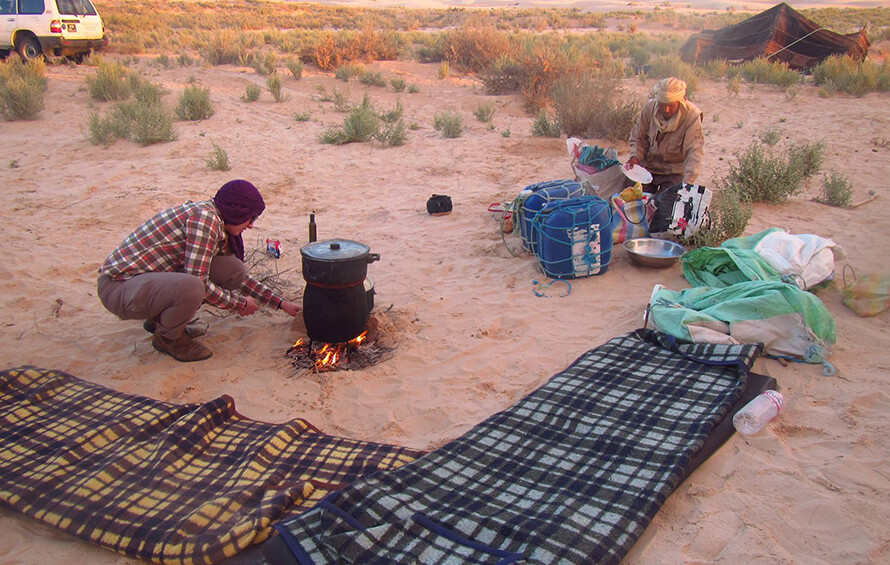 - Installation des tentes et préparation de votre dîner au feu de bois où vous assisterez à la préparation du pain de sable.
